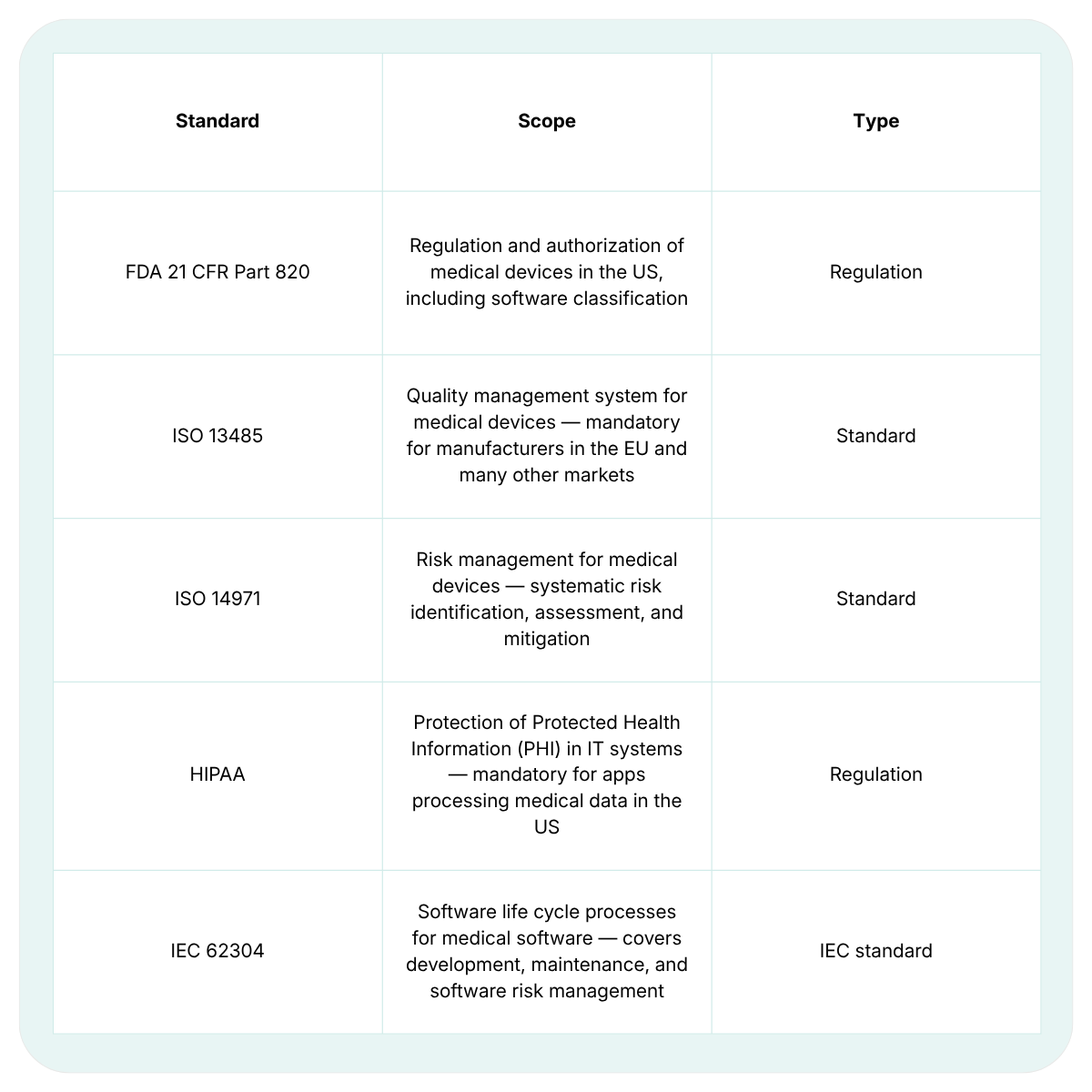 - Compliance by design (FDA, ISO 13485, ISO 14971, IEC 62304, HIPAA) is non‑negotiable and must be embedded from the first sprint.